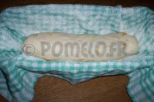 Lorsque la pâte a doublé de volume, sortez la du saladier et retravaillez là quelques minutes. Formez ensuite un « boudin » que vous placerez dans une corbeille en osiez allongée (toujours avec un torchon fariné). Si vous n’en avez pas, pas grave, gardez le saladier avec le torchon fariné (votre pain n’aura simplement pas la même forme que le mien). Farinez le dessus de la pâte et couvrez d’un autre torchon.