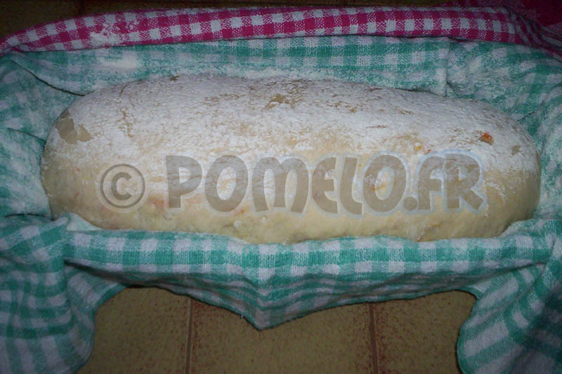 Au lieu d’être rond, ce pain est allongé. Si vous voulez revoir ou découvrir comment je procède, je vous propose d’aller jeter un œil à ce billet pour avoir les photos et les étapes ;)