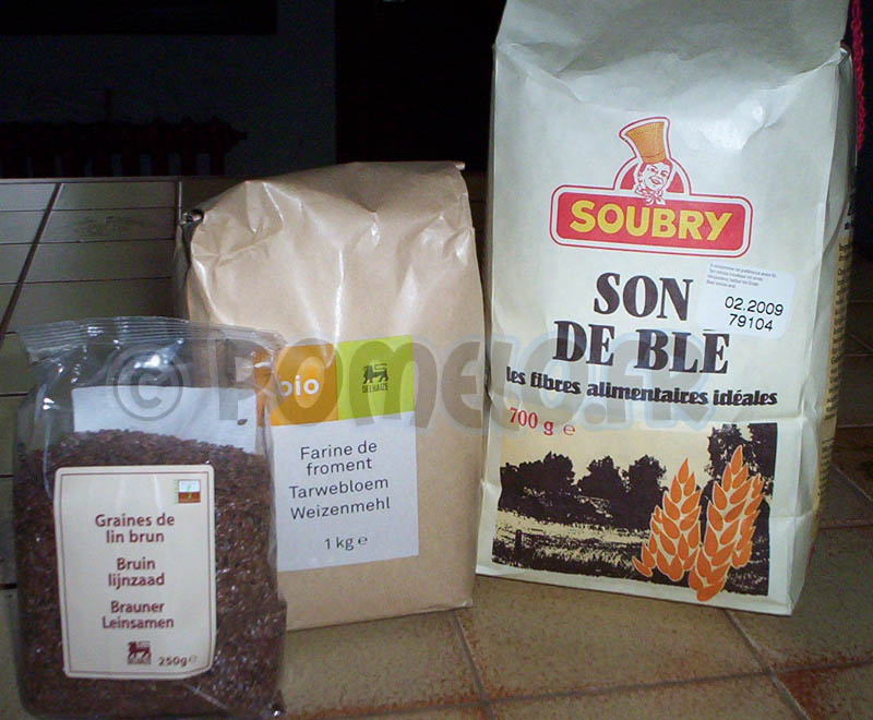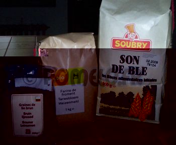 Donc de gauche à droite : Des graines de lin Brun, de la farine de Froment T65 Bio et du Son de Blé :)