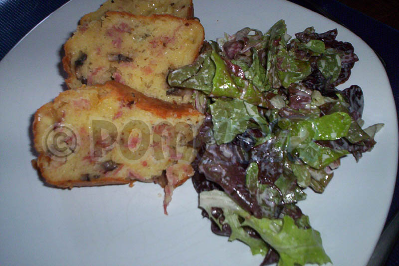 A la base, il s’agit d’un cake Auvergnat car il est censé contenir du jambon d’Auvergne ainsi que du Tomme d’Auvergne. Il devait également y avoir du lait entier mais moi j’ai fait moitié lait demi-écrémé, moitié crème fraîche épaisse.