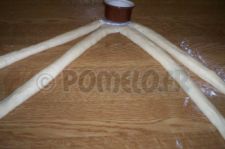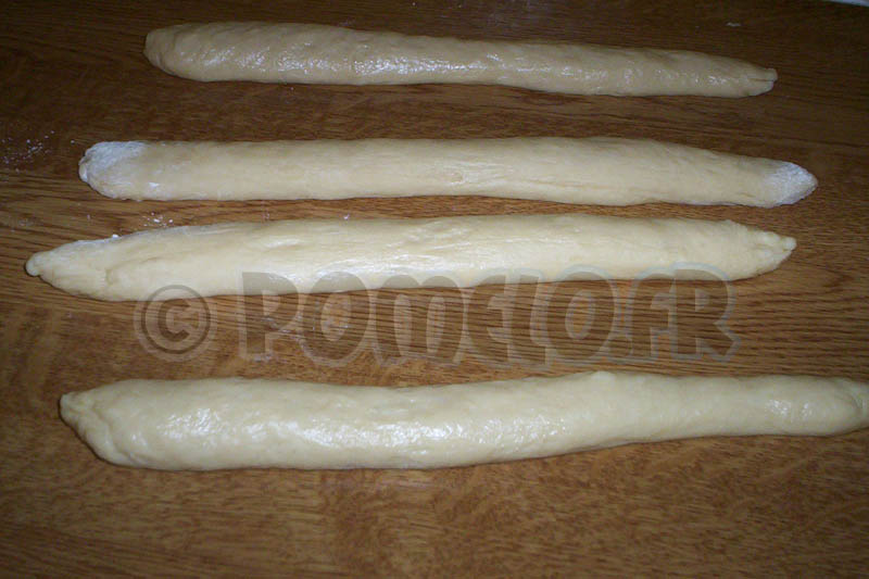 Lorsque la pâte a doublé de volume, sortez là du saladier et déposez là sur le plan de travail. Séparez en 3 ou 4 boules de poids identique afin de faire une tresse. Je ne peux malheureusement pas vous mettre des photos car j’étais seule au moment du façonnage et j’avais besoin de mes deux mains ! Je peux cependant vous montrer deux photos : les pâtons allongés et la phase de départ pour la tresse (4 boucles pour ma part).