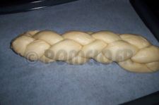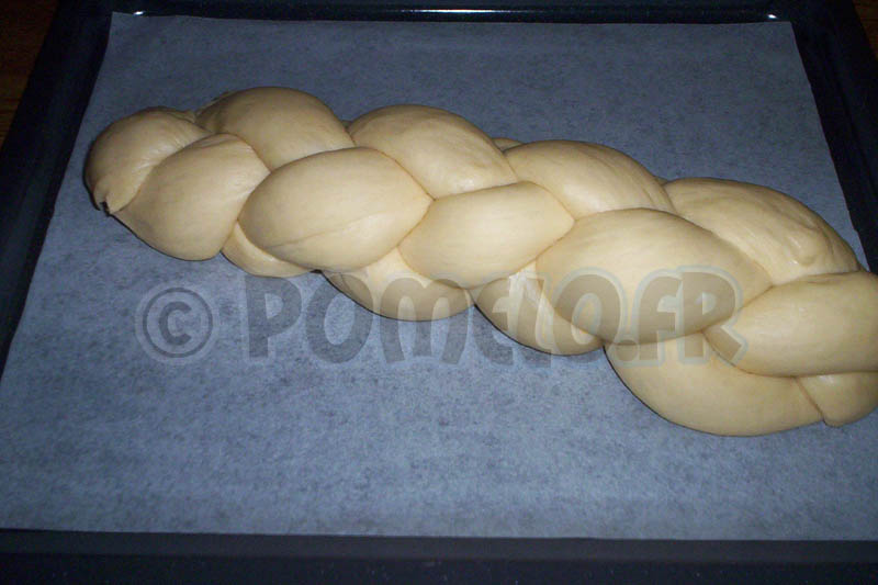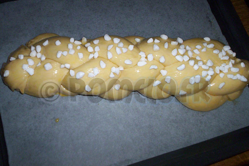 Préchauffez le four à 180°C, badigeonnez la surface de la tresse avec le mélange lait / jaune d’oeuf, parsemez de sucre perlé.