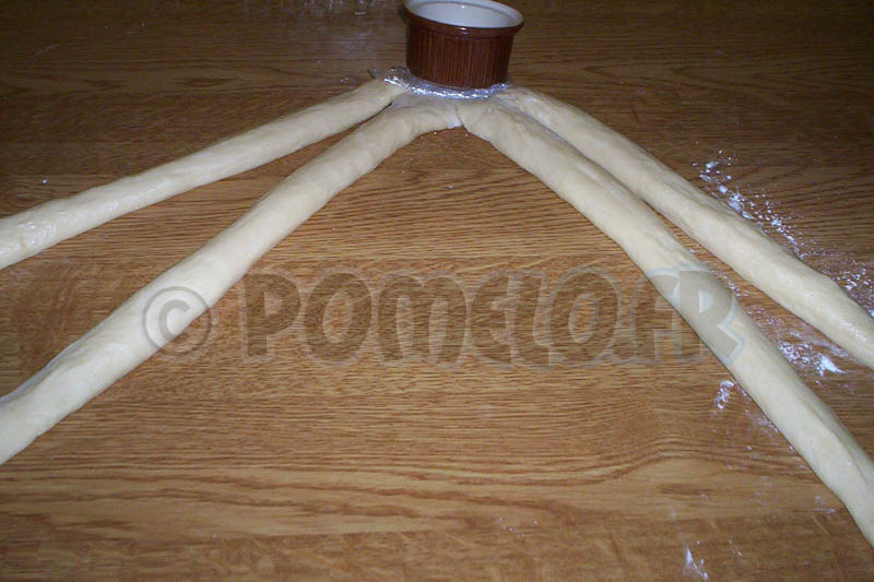 J’ai placé mes 4 « boudins » sur le plan de travail, je les ai soudé en haut avec les doigts et j’ai posé un petit pot pour éviter que cela ne bouge pendant le tressage. Si j’ai encore l’occasion de faire une tresse, je tenterai de demander à mon cher et tendre de prendre des photos ou mieux, de filmer !