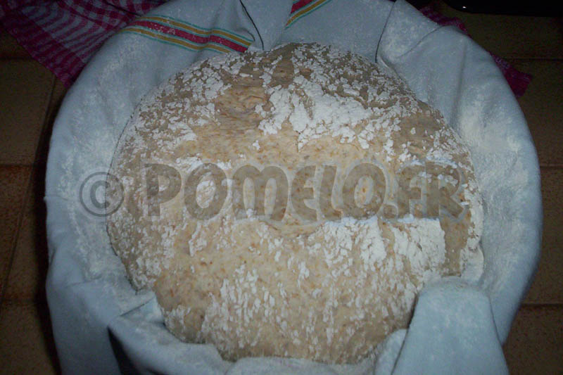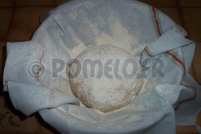 Lorsque la pâte a doublé de volume, sortez la du saladier et retravaillez là quelques minutes. Reformez une belle boule que vous placerez dans un torchon fariné dans un saladier. Farinez le dessus de la boule et couvrez d’un autre torchon.