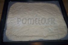 Laissez reposer la pâte quelques minutes. Dégazez et travaillez là un peu. Formez une belle boule et étalez en un grand rectangle (plan de travail toujours bien fariné sinon, ça colle ! ) que vous placerez sur une feuille de papier sulfurisée dans le lèche-frite ou sur une plaque à pâtisserie Vous pouvez laisser un bourlet sur le tour de la pâte.
