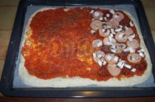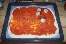 On commence par badigeonner toute la surface (sauf les bords) par de la sauce tomate maison.