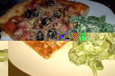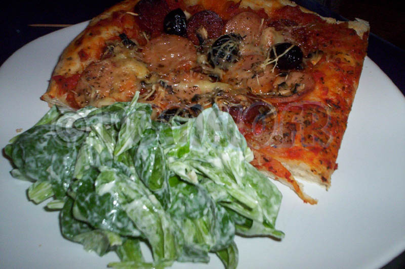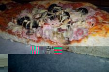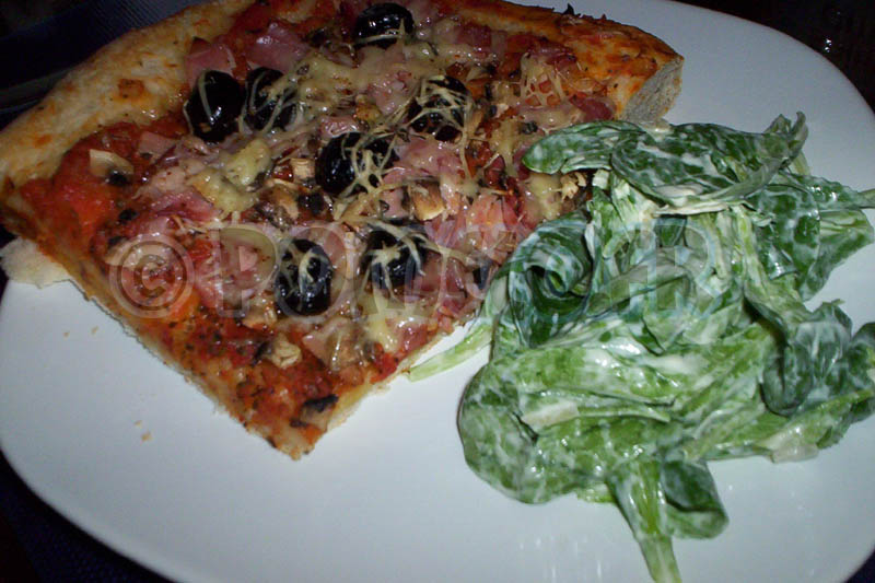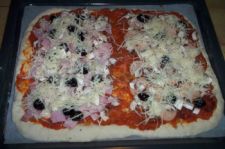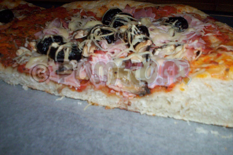 – Moi c’était : sauce tomate maison + jambon + champignons + olives noires + fromage râpé