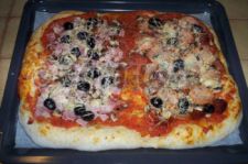 Cela faisait déjà un bon moment que je n’avais pas fait de pizza fraîche alors j’ai décidé de m’y coller. J’envisageais de suivre la recette d’un livre pour la pâte mais ça n’a pas fonctionné. Donc, « en dernière minute », j’ai fait une autre pâte (ma pâte habituelle) et là aucun souci !