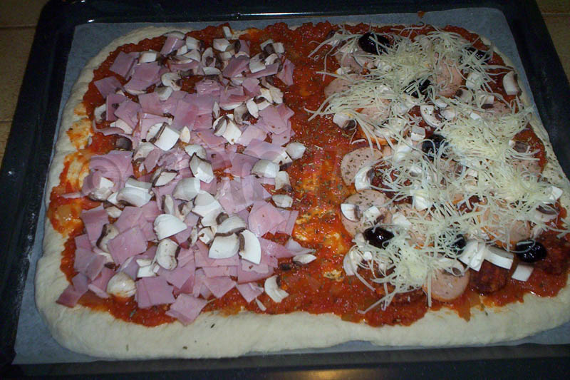 Moi, j’avais envie d’une pizza jambon/champignons alors que zhomme voulait autre chose. Et bien nous avons chacun utilisé une garniture différente :D