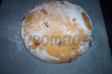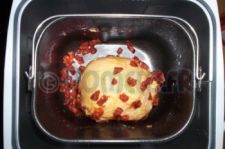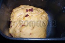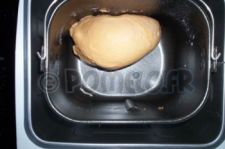 Au bout de 10 minutes (quand le pâton est bien formé) ajoutez le poivron et le chorizo coupés en petits dés. Laissez le programme pâte se terminer tout seul. Si le pâton s’humidifie trop à cause du poivron, ajoutez un peu de farine.