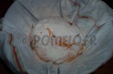 Dégazez-le légèrement travaillez la pâte quelques instants, reformez une boule et placez-la dans le torchon farine (dans un saladier), soudure vers le haut. Farinez légèrement le dessus et laissez lever environ 30-40 minutes. La pâte doit bien gonfler bien mais pas trop car elle doit encore avoir de la force pour la cuisson !