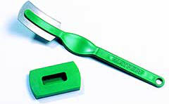 Beaucoup de gens comme moi utilisent des lames de rasoir ou un cutter. Jusqu’à aujourd’hui, j’utilisais une lame (propre et neuve bien sûr) pour le grattoir qui me sert à nettoyer ma plaque de cuisson vitrocéramique. C’est un peu comme une lame de rasoir mais pas franchement pratique à manipuler.