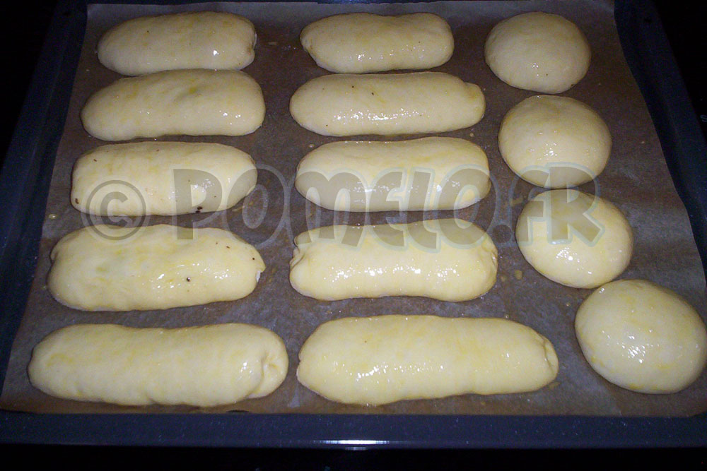 Badigeonnez vos petits pains au lait d’œuf battu et enfournez à four préchauffé à 180°C pour 15-20 minutes.