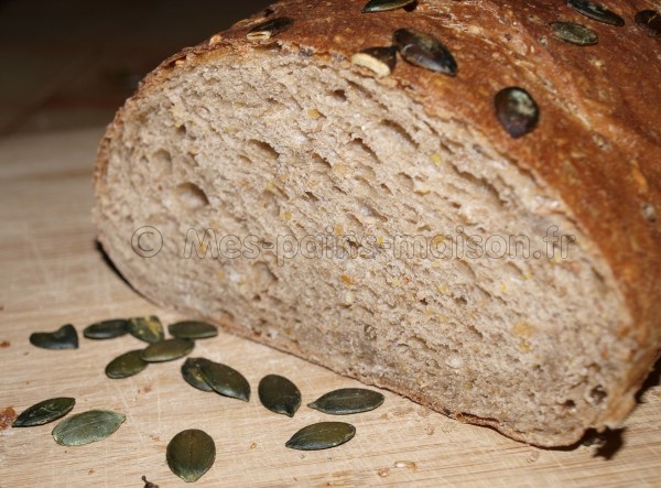 J’ai fait ce pain deux jours de suite (pour dire si il est bon :P ) et la deuxième fois, j’y ai ajouté des graines de courge sur le dessus uniquement (une fois grillées avec la cuisson du pain, c’est extra !)