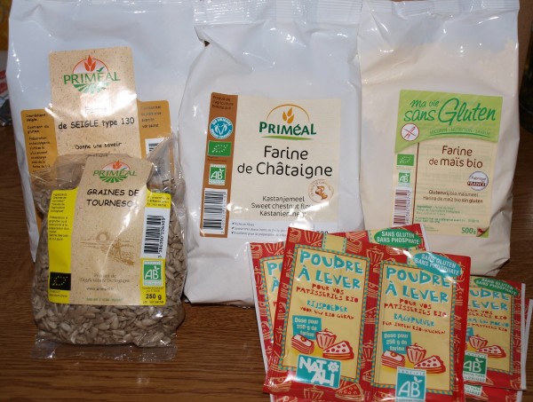 Farine de châtaigne, de seigle et de maïs (attention, sans gluten celle là) mais aussi graines de tournesol et poudre à lever pour pâtisseries :)