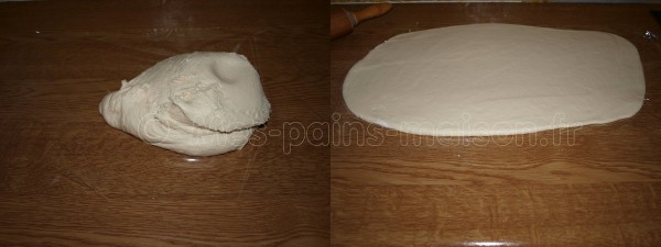 Préparer un grand rectangle de film alimentaire et le poser sur votre plan de travail. Verser la pâte sur ce film, fariner légèrement le dessus du pâton et l’étaler en un rectangle dont un des côté ne sera pas plus grand que votre plaque à pâtisserie (une fois roulée, la brioche doit pouvoir être placée sur la plaque !)