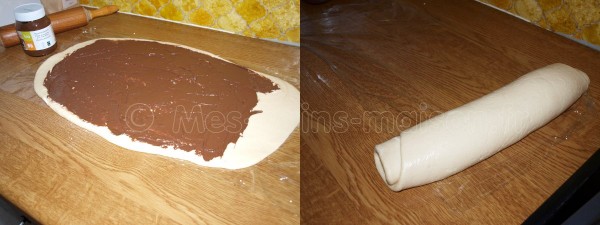 Étaler de la pâte à tartiner sur la surface de la pâte comme sur la photo ci dessous (je n’ai pas été jusqu’à l’extrémité de droite car je veux que la pâte puisse se souder sans glisser à cause du chocolat :) )