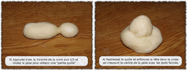 4/ Redressez la quille et enfoncez la tête dans le corps en creusant le centre de la pâte avec les doigts farinés (voir vidéo ci-dessous)