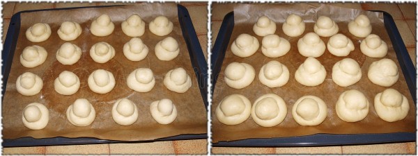 Disposez ces briochettes sur une plaque de cuisson (avec un papier sulfurisé). Essayez de les espacer correctement car elles vont gonfler et risquent de se toucher à la cuisson.