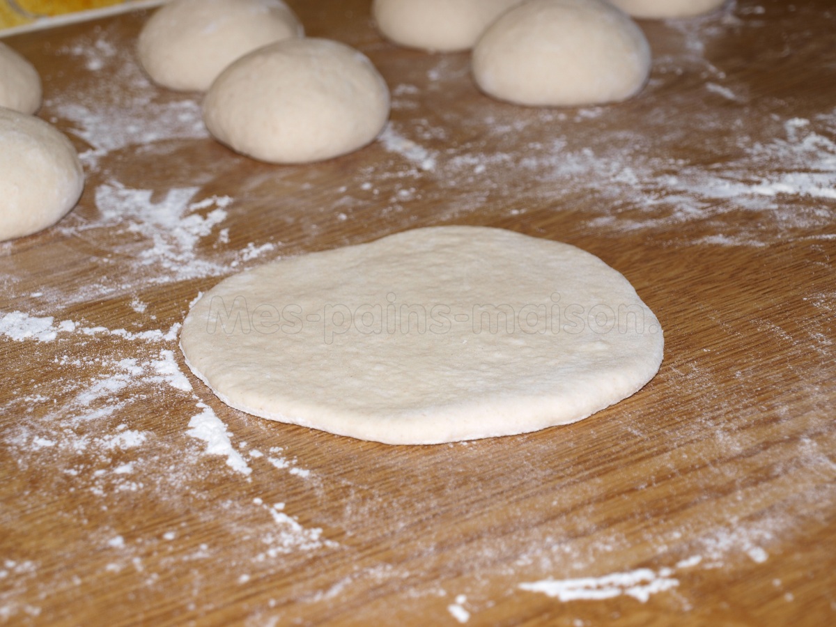 Farinez le plan de travail et y verser la pâte qui doit avoir doublé de volume. Découper des pâtons d’environ 85 gr. Donnez leur la forme d’une boule et laissez ces boules reposer environ 10-15 minutes couvertes d’un linge.